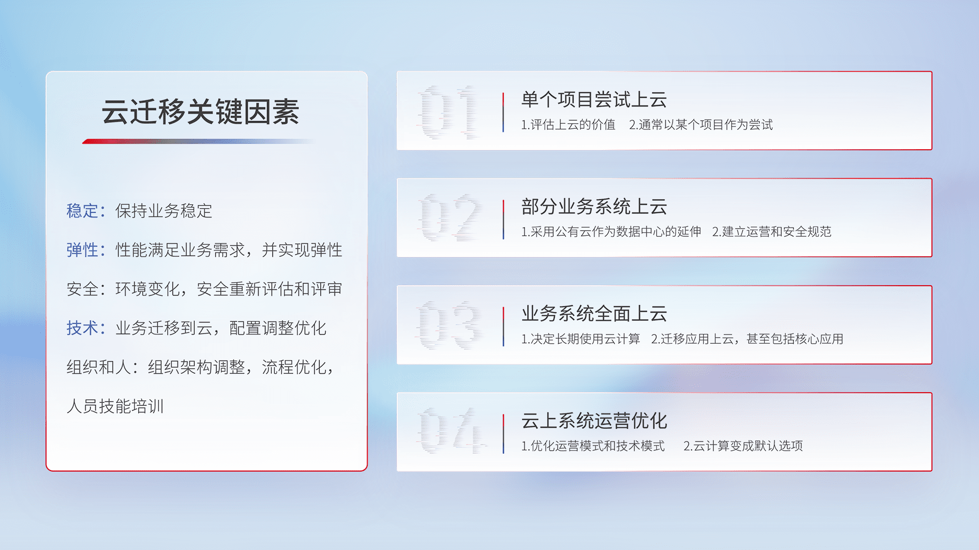 结合实际业务,,,从规划设计、、云平台选型、、、、云原生改造、、、数据迁移、、集成交付,,,,迁移全过程为客户识别最佳上云路径,,,做好风险识别管理,,,,设计网络架构、、、身份权限、、、安全审计合规、、、操作审计、、日志审计、、监控告警策略、、、、多站点容灾设计等,,,,对云上基础设施进行整体规划,,提升IT治理水平,,,,以满足弹性、、、、高可用、、、高性能的需求。。。