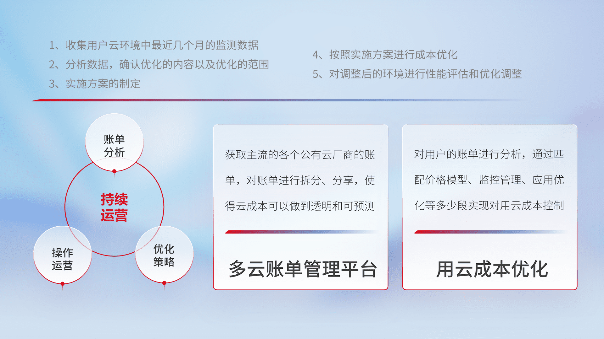 通过多云纳管,,,以统一的资源数据模型把客户的云资源进行抽象和封装,,,进而实现对多云资源的统一操作,,,,保障云资源管理的可靠性、、稳定性与可用性。。。。量身定制化运维内容,,配置、、开发运维、、、补丁管理、、、、备份、、、监控、、、认证和访问管理、、审计和日常巡检等,,保障在用云过程中的可靠度,,,,稳定度以及高可用率。。。。